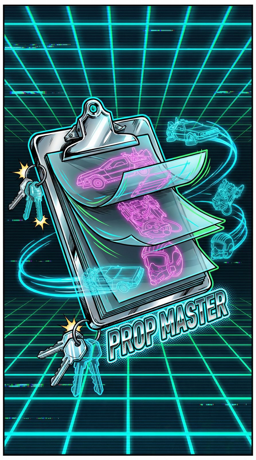 The Prop Master manifests as a translucent chrome clipboard with pages that flip through holographic inventories of every iconic 80s prop—from proton packs to enchanted swords to test pilot helmets. A neon-lit keyring dangles from its corner, each key granting access to a different league's prop vault, while VHS-static crackles across its surface whenever a prop is being transferred between movie realities. Miniature holographic replicas of active props orbit the tag, showing real-time deployment across the VaporGrid's ten cinematic universes.