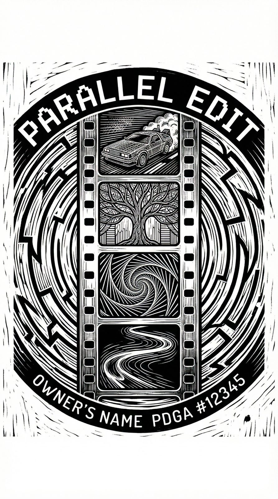 Parallel Edit manifests as a chrome film strip where individual frames alternate between the ten league aesthetics—a heist getaway bleeds into a fantasy forest, which cuts to psychological spirals, then night warrior glow trails. Each frame pulses with synchronized neon in that league's signature color palette. The strip forms an infinite loop, with VHS tracking lines splitting and rejoining to show the constant intercutting process. When activated, the tag projects ghostly wireframe overlays of all ten courses simultaneously, revealing how a throw in one league mirrors strategic opportunities in another.