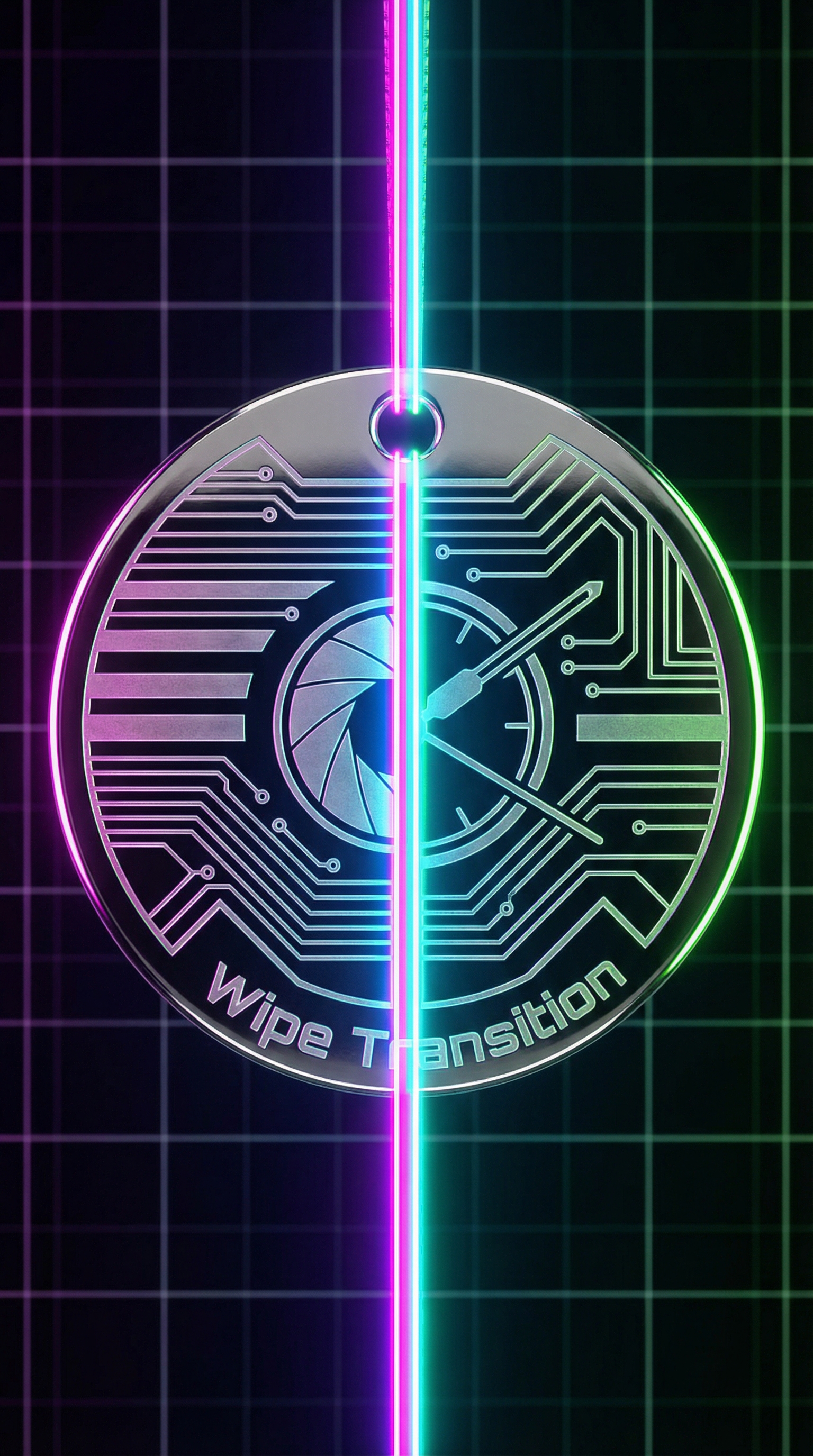 So they coded the first Wipe Transition protocol: a razor-sharp geometric edge that physically travels across the wireframe landscape, emitting dual-colored neon light as it cleanly separates one absurd 80s reality from another. Horizontal bars, vertical curtains, circular irises—the whole George Lucas playbook.