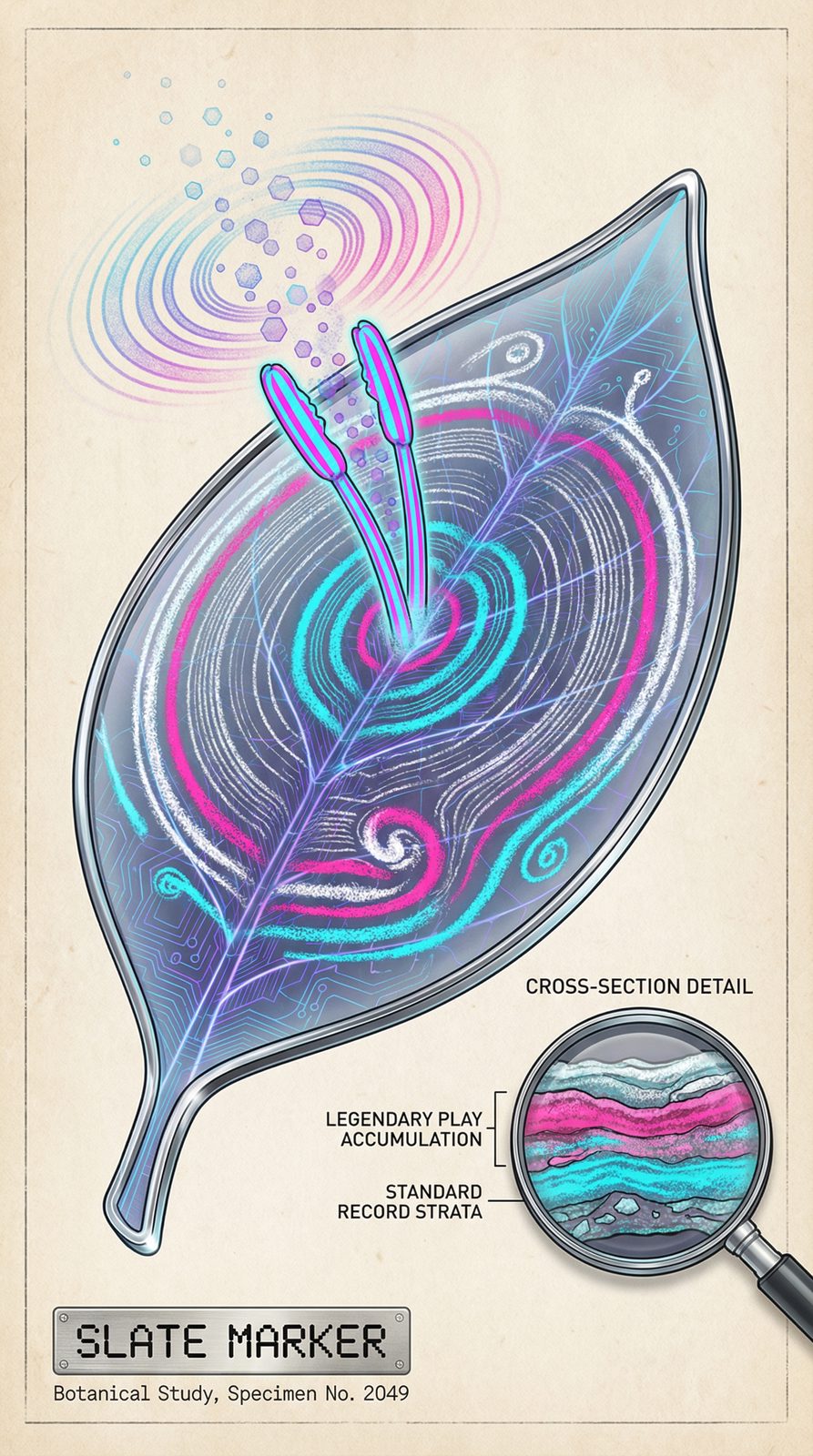 Appears as a translucent clapperboard floating in the VaporGrid, its striped sticks leaving trails of colored light when they snap together. The board's surface is a living archive of luminous chalk marks and scene numbers, each one corresponding to a player's marked moment, with the most legendary plays burning brightest in hot pink and electric cyan. Creates the distinctive 'clack' sound that synchronizes all ten league narratives, while digital readouts flicker across its face in arcade-style fonts, displaying evolving scene and take numbers that accumulate as players progress through different movie genres.