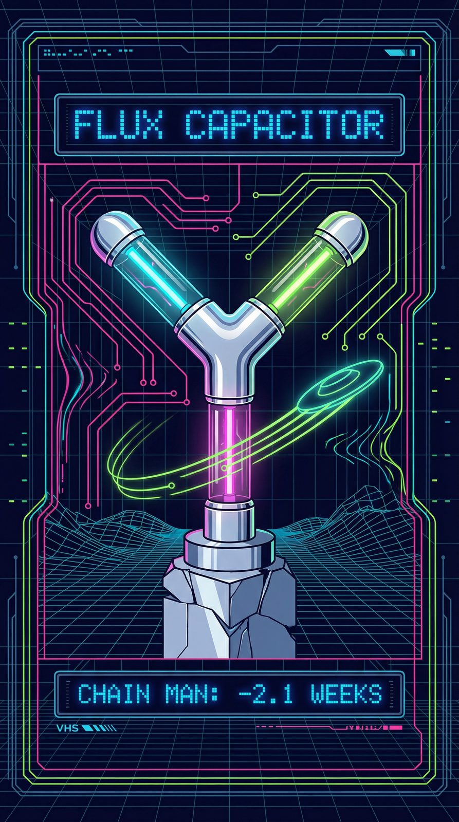 The Flux Capacitor manifests as a chrome Y-shaped housing containing three pulsing neon tubes—cyan, magenta, and lime green—that glow with intensity proportional to temporal stability across the ten leagues. Its electromagnetic field visibly warps the VaporGrid's wireframe geometry within a three-meter radius, creating rippling distortions that players can use to identify temporal junction points. The device emits a characteristic high-pitched whine that modulates based on narrative tension, rising to near-painful frequencies when multiple league timelines approach convergence. Its chrome surface is perpetually covered in scrolling VHS tracking artifacts that accelerate during 'rewind' sequences and reverse during 'fast-forward' events, providing visual feedback on the series' chronological state.