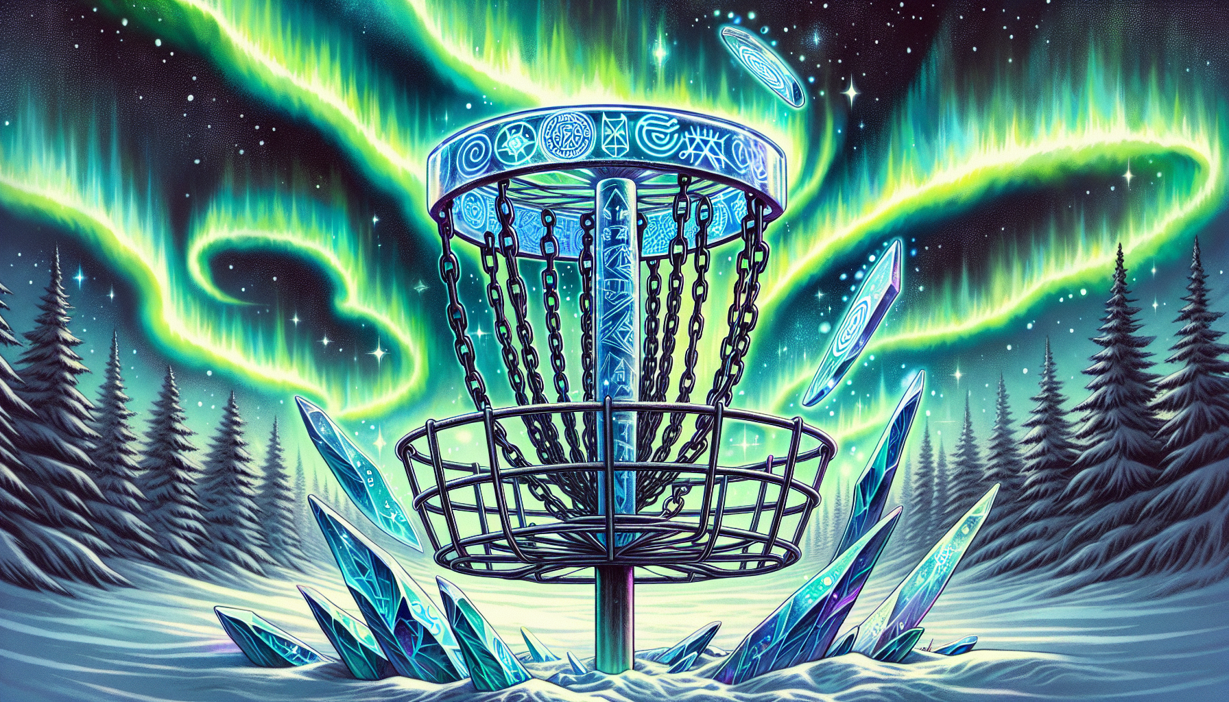 The Beacon takes the form of a disc golf basket sculpted from translucent glacial ice, its intricate latticework etched with ancient runes. When activated, it unleashes swirling auroras in hues of emerald and sapphire, illuminating the surrounding terrain with ethereal light.