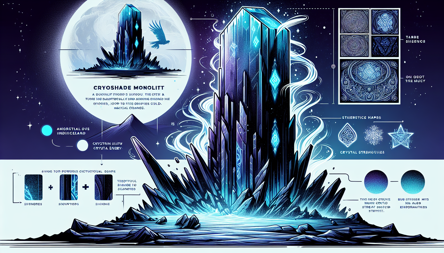 The Cryoshade Monolith is a towering structure made of an unknown, crystalline material that seems to shimmer with an inner light. It is perpetually cold to the touch, and its surface is covered in intricate, glowing runes that shift and change when exposed to moonlight. The monolith emits a faint, eerie hum that can be felt more than heard, and it has the ability to create localized areas of extreme cold, freezing anything that comes too close.