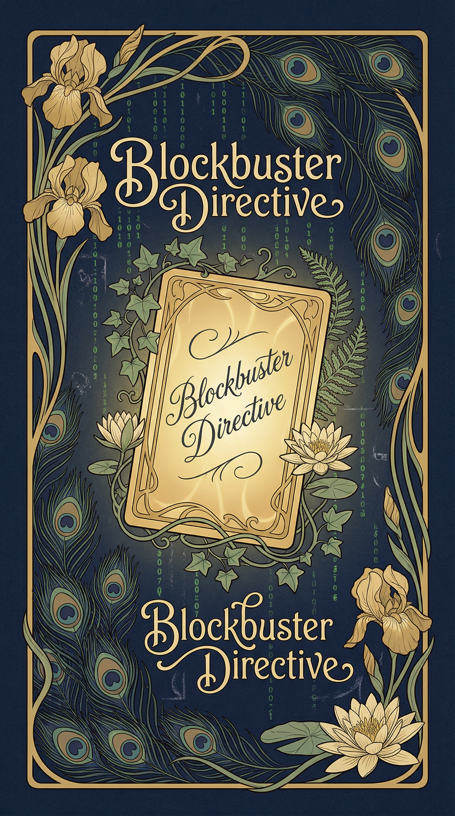 The Blockbuster Directive manifests as a hovering golden membership card rimmed in midnight blue neon, its surface constantly rewriting itself with new instructions in bold Blockbuster sans-serif font. When activated, it projects columns of scrolling green code that occasionally glitch and transform into iconic 90s movie quotes—each quote containing a hidden rule or command. The card's edges crackle with VHS tracking line distortion, and its reflection shows not your face but the simulation you're currently trapped within.