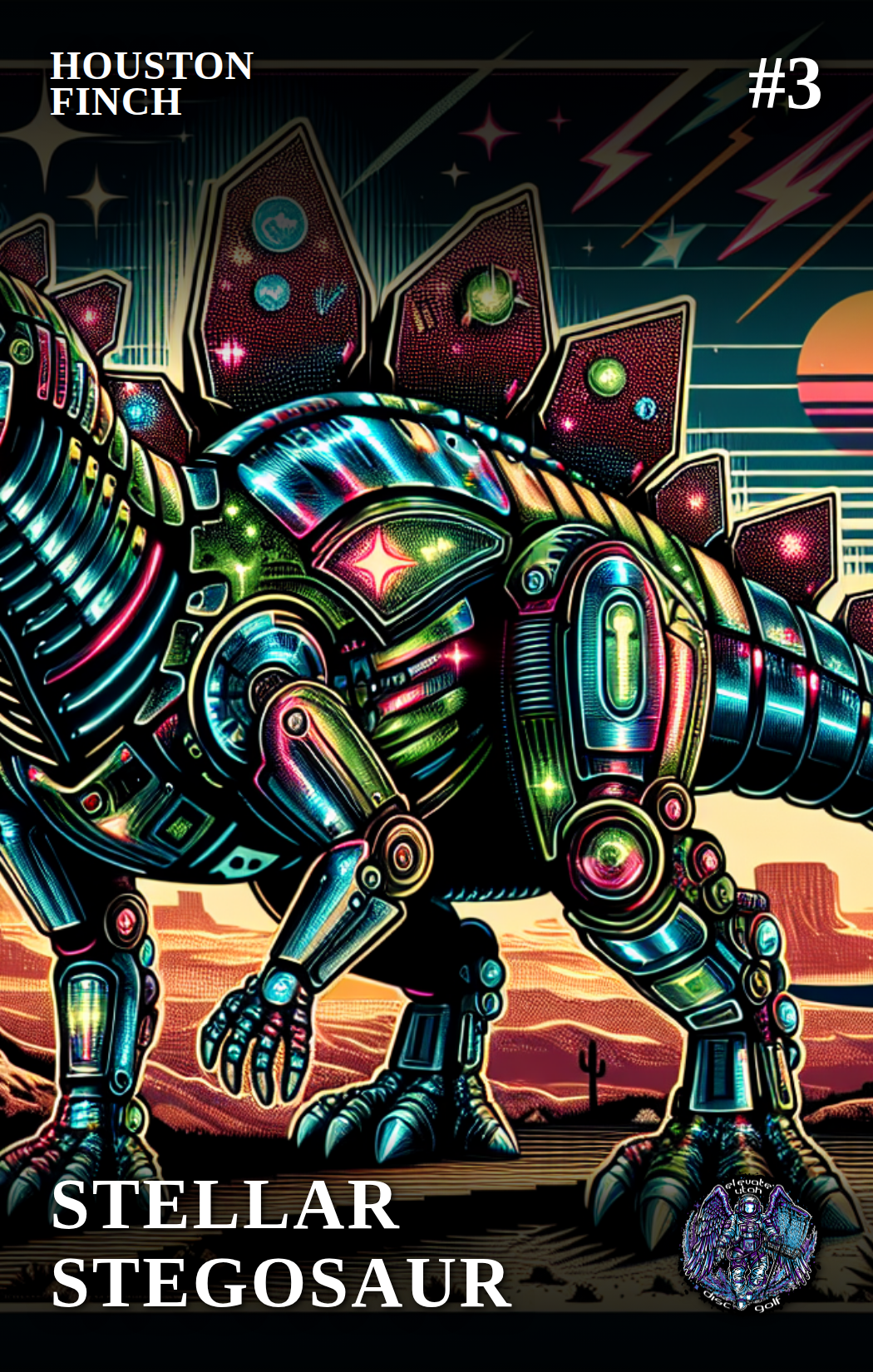 The Stellar Stegosaur is a massive dinosaur with glowing cybernetic plates along its back, powered by cosmic energy. Its tail is equipped with a plasma-powered thagomizer, capable of delivering devastating blows. The creature's skin is reinforced with nano-fibers, making it nearly impervious to damage. Its eyes glow with a star-like brilliance, giving it an otherworldly appearance.