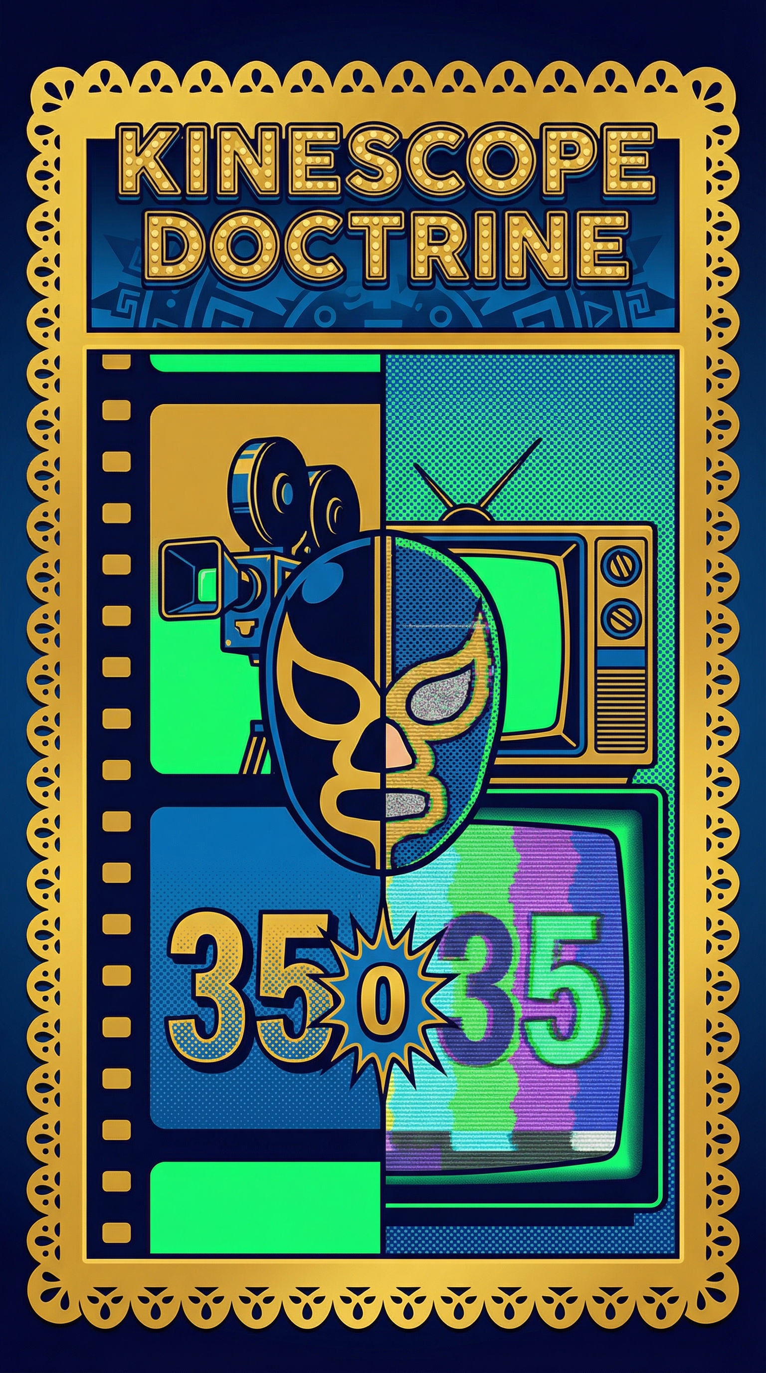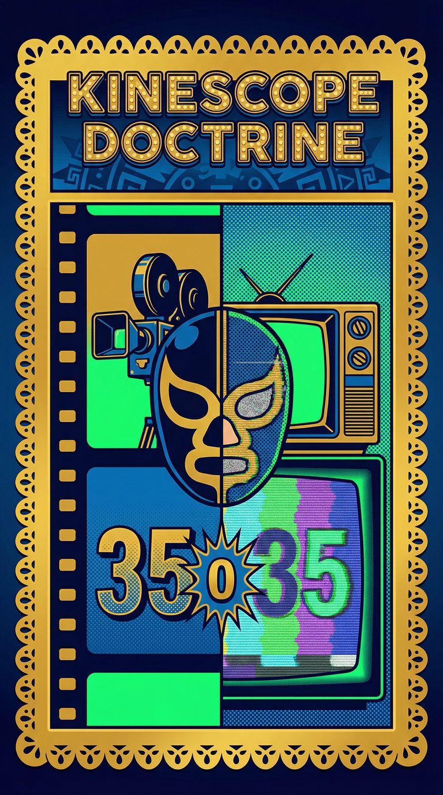 The Kinescope Doctrine exists as the perpetual moment of transfer between formats - 35mm film grain colliding with CRT scanline resolution in frozen transition. It manifests as overlapping layers where sprocket holes align with VHS tracking lines, creating a visual paradox of dual existence. Physical tags display this conversion state: half the image shows film grain texture, half shows video scanline artifacts, with the border between them constantly shifting like a vertical hold malfunction. The tag never settles into one format, embodying the doctrine's core principle that recorded truth exists in the translation, not the source.