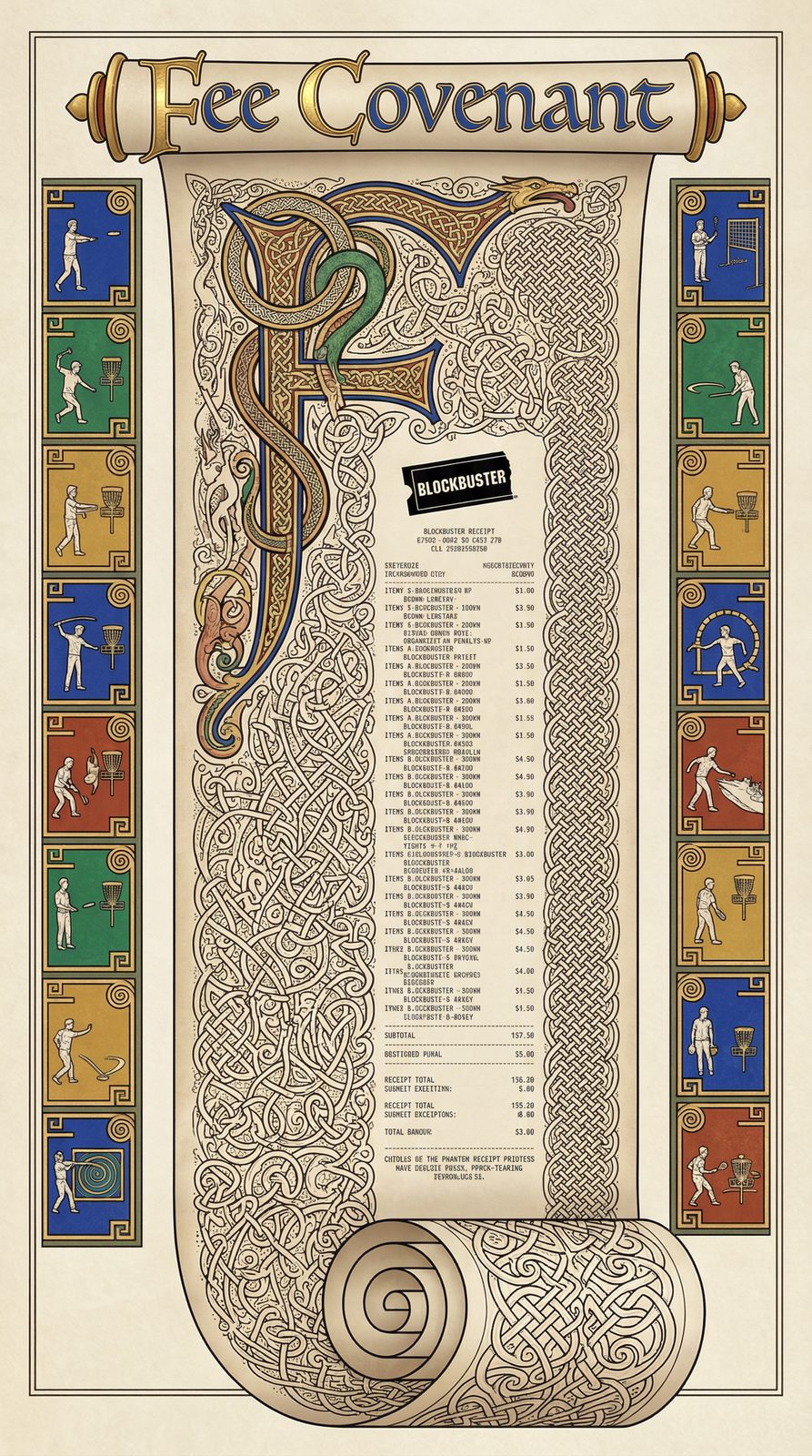 The Late Fee Covenant exists as an ever-lengthening thermal receipt printed in Blockbuster's signature yellow-and-blue ink that never fades despite being decades old. Each missed simulation appearance adds another itemized line to the receipt, with penalties compounding at rates that would make credit card companies blush. The paper itself defies physics—it continues printing from no visible source, rolling onto the floor in growing coils that document every absence across all 16 movie simulations. The receipt has that distinctive thermal paper texture—smooth, slightly waxy, and prone to curling—except this receipt never tears cleanly and never stops printing.
