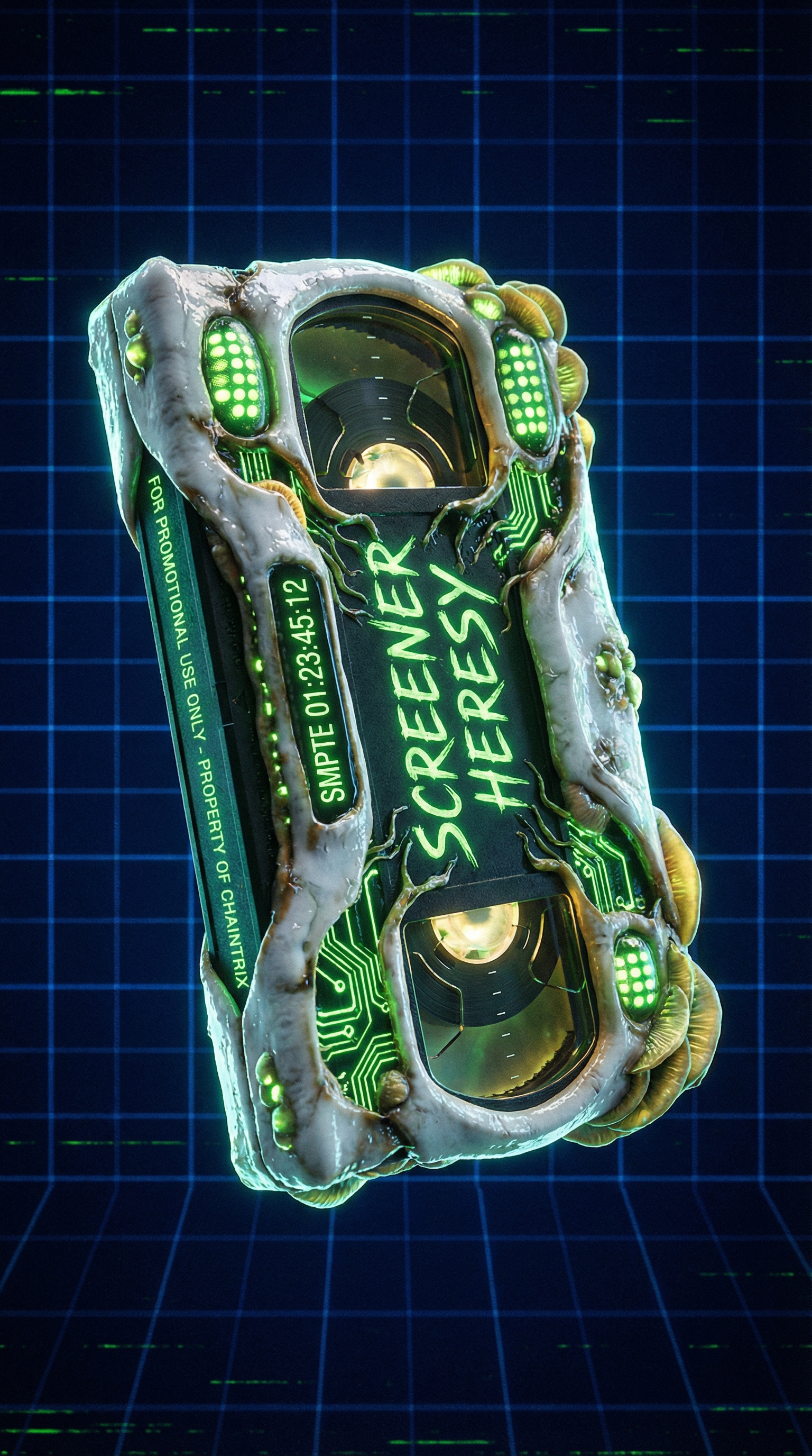 The Screener Heresy manifests as a degraded VHS cassette with 'FOR PROMOTIONAL USE ONLY - PROPERTY OF CHAINTRIX' burned across every frame in semi-transparent block letters. The footage quality deliberately degrades toward the end, with the final three minutes replaced by black screen and timecode—the Chaintrix's insurance that even privileged early viewers can't see how simulations truly conclude. Each tape bears handwritten labels with cryptic reviewer codes that don't match any registered player ID, suggesting the system has always had invisible judges evaluating performances before official premiere nights.