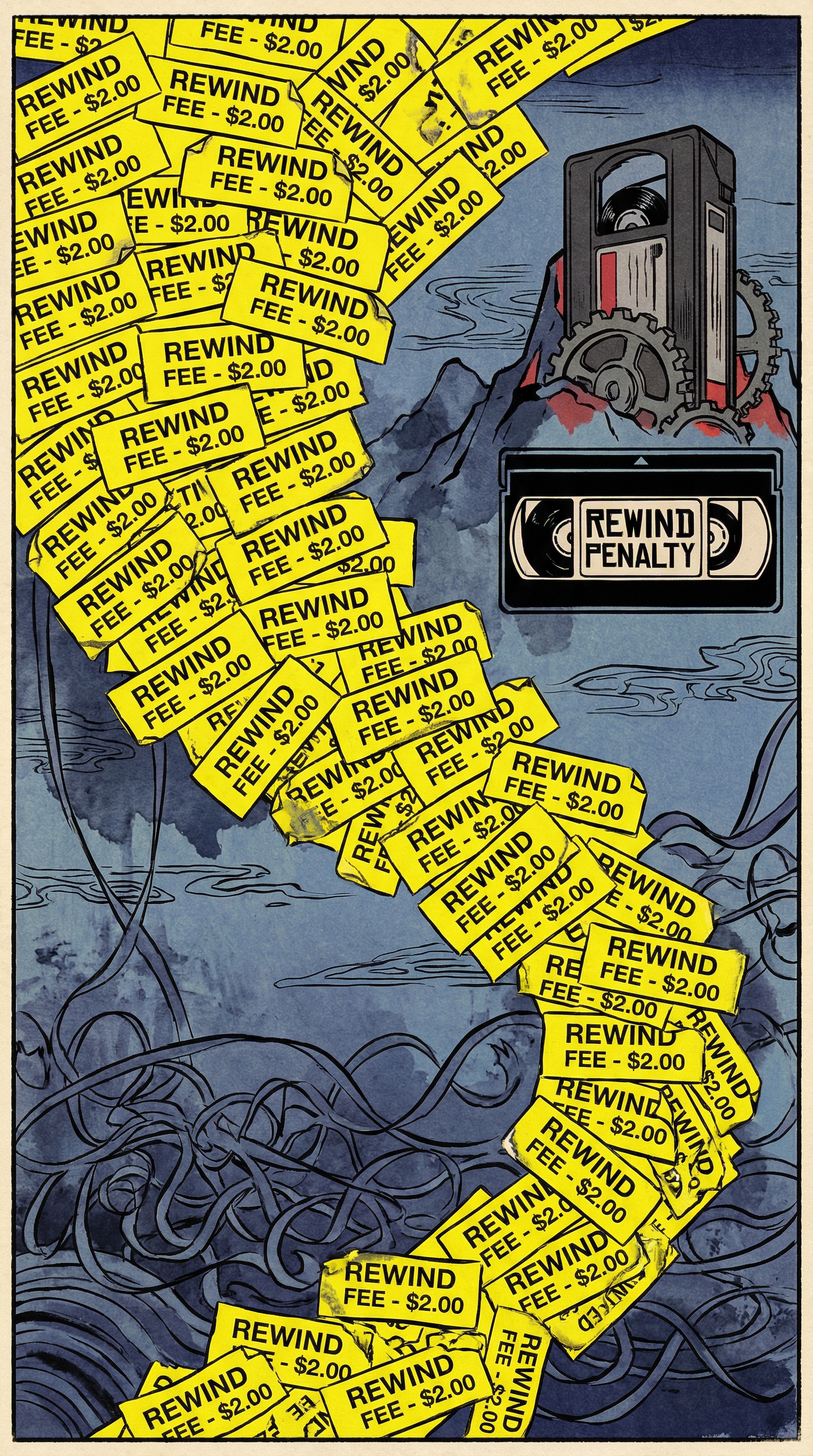 Born in the gap between rented and returned, the Rewind Penalty crystallized from the frustrated sighs of video store clerks who spent their shifts manually rewinding tapes that lazy customers couldn't be bothered to prepare for the next viewer, transforming retail exhaustion into a self-enforcing system that now operates across all Chaintrix simulations without human intervention.