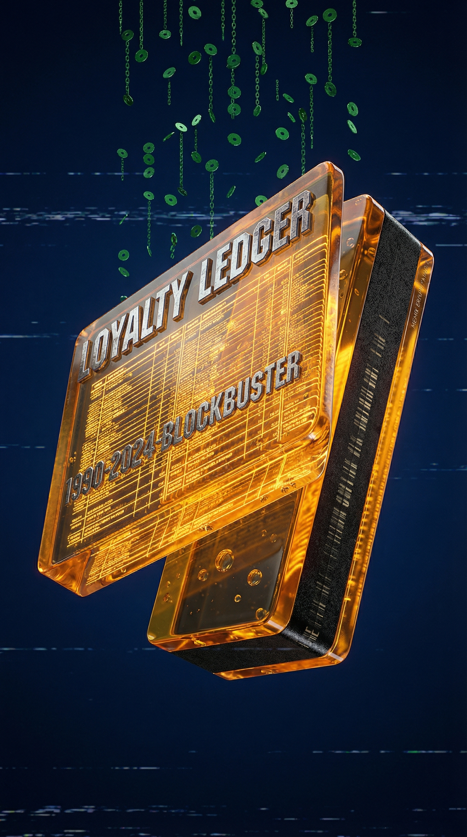 The Loyalty Ledger manifests as an oversized Blockbuster membership card constructed from translucent amber acrylic, its surface etched with infinite rows of ledger lines that glow in Blockbuster-gold neon. The magnetic stripe along its back constantly rewrites itself in real-time, creating audible clicking sounds like receipt printers firing in rapid succession. Its face displays each player's running account balance in VHS-green digits that increment with attendance and decrement with absences, the numbers occasionally flickering with VHS tracking static when the calculation updates across all 16 simulations simultaneously.