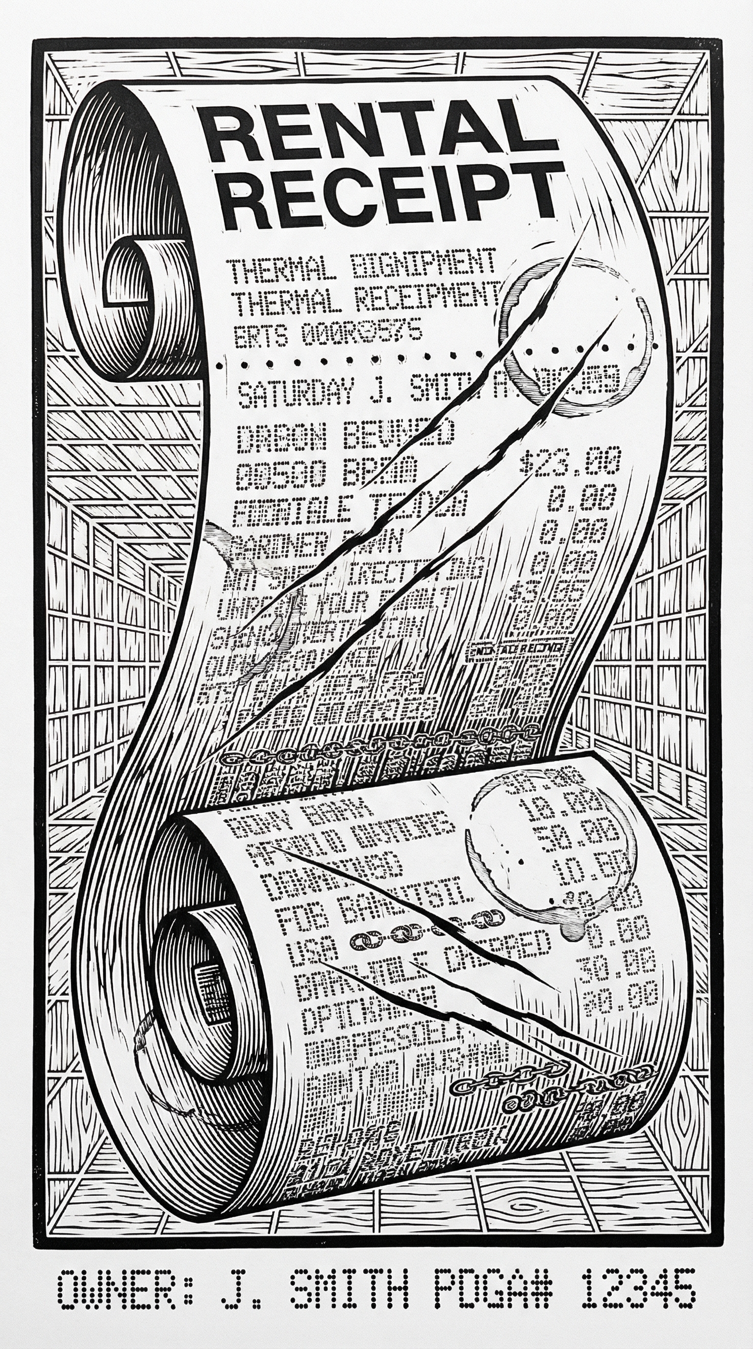 The Rental Receipt manifests as endless thermal paper emerging from an invisible dot-matrix printer, each line item documenting a player's attendance with time-stamped precision. Its carbon-copy layers reveal shadow versions of the same transaction—what was paid versus what was owed, what was returned versus what went missing. The paper itself resists fading despite being thermal stock, maintaining its proof indefinitely while accumulating fold lines and coffee stains that somehow make it more authoritative rather than less, as if authenticity requires evidence of having survived actual counter conditions.