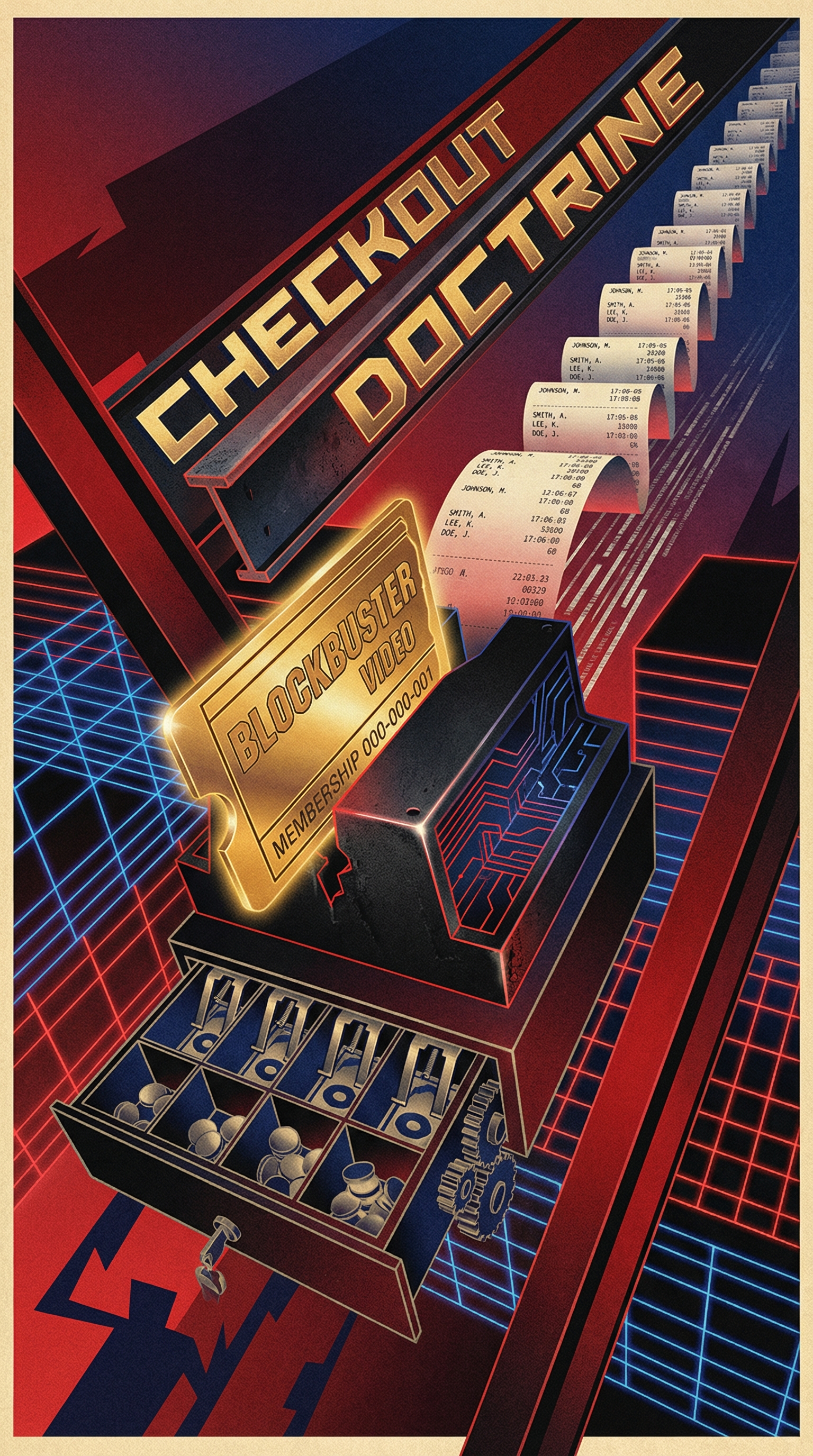 The Checkout Doctrine manifests as a membership card frozen mid-swipe through a magnetic reader, its stripe caught in the eternal moment between commitment and consequence. Below it, a thermal receipt printer runs continuously, listing every registered player who checked out a simulation slot but failed to return—names in faded ink that never stops accumulating. Behind both, a cash register drawer hangs perpetually open, unable to close until every outstanding obligation across all 16 movie simulations is satisfied or penalized. The entire assembly exists in a state of suspended transaction, proving that in the Chaintrix, checking out creates debt that persists until attendance settles the account.