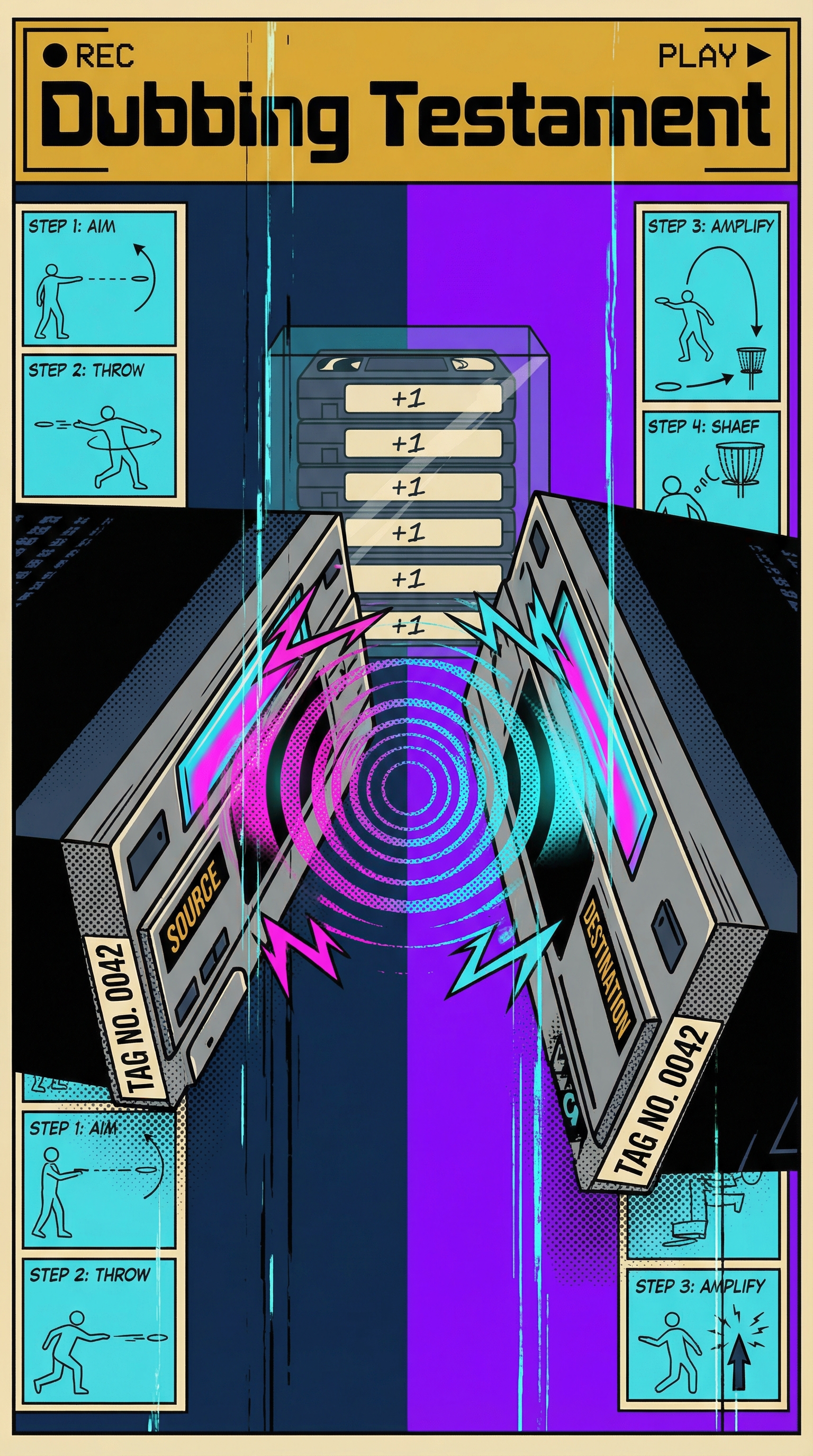 The Testament manifests as a dual-deck VCR frozen mid-dub, its twin tape wells glowing with synchronized magnetic transfer. Each successful copy across simulations adds another handwritten label to an ever-growing stack of dubbed tapes visible through transparent housing. The generation counter displays not degradation but amplification—each copy adding +1 to total testimony strength rather than -1 to quality. Magnetic oxide particles visibly stream between source and destination decks like glowing data, proving duplication is active witnessing rather than passive replication.