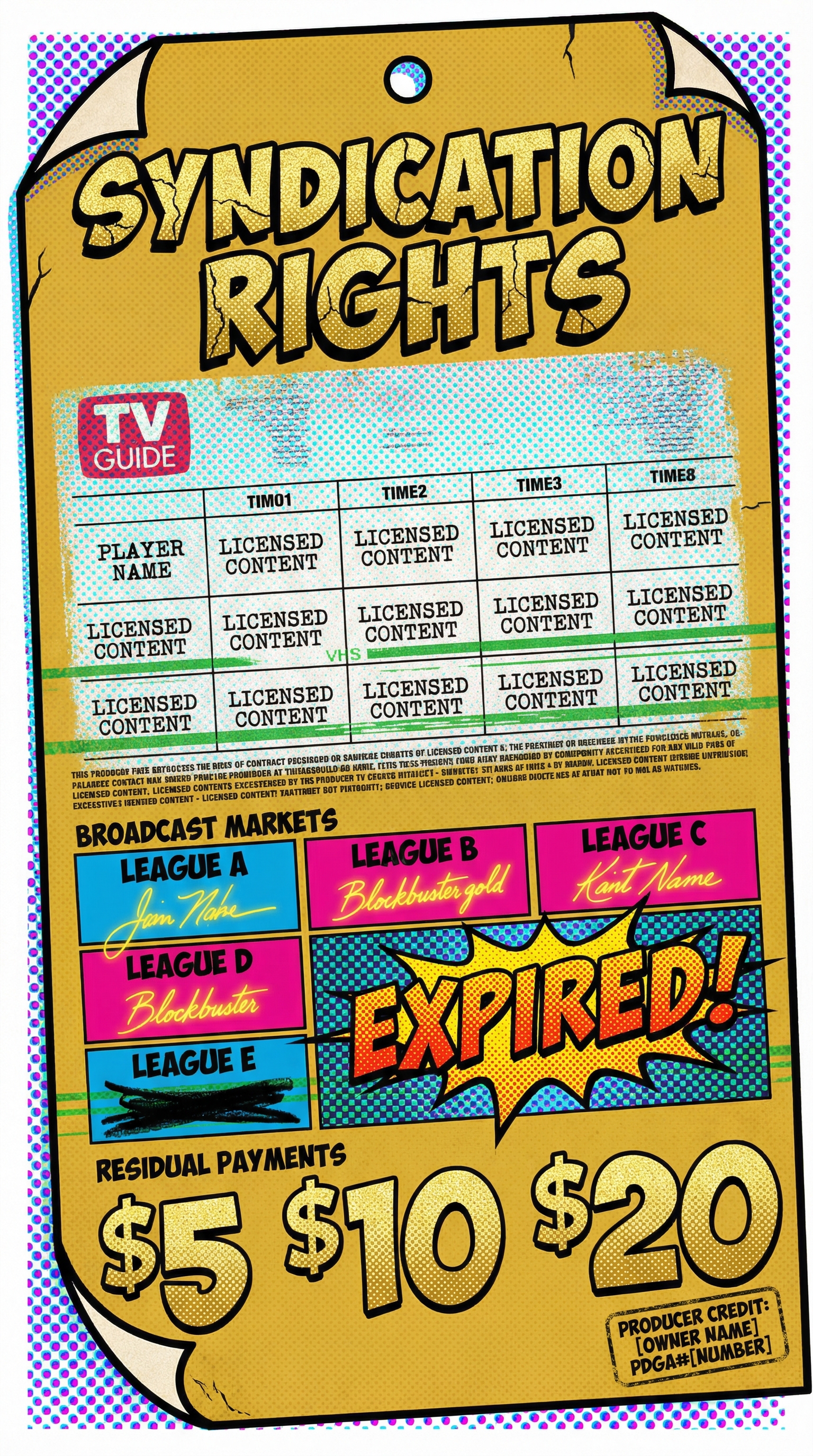 Appears as a vintage syndication contract printed on yellowing legal paper, with league names listed as 'broadcast markets' and attendance dates as 'air times.' Each appearance in a different league adds another signature line and increases the 'residual value' printed at the bottom in ascending dollar amounts. Background features a faded TV Guide grid showing the same player name repeated across multiple time slots (leagues), with static interference between channels. Contract edges curl like old paperwork, with coffee stains and Blockbuster stamp marks proving this document has been processed through multiple rental cycles.
