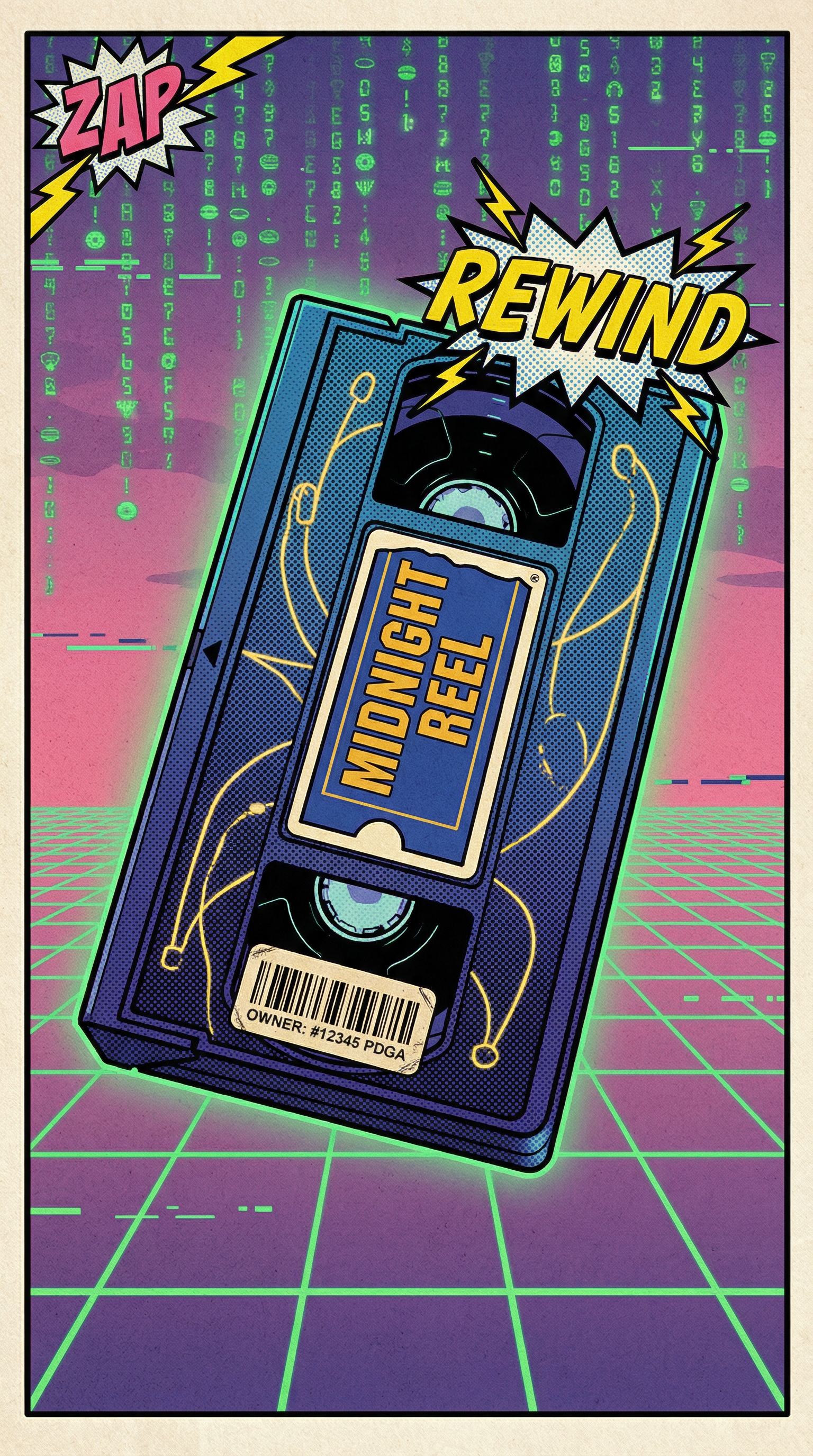 The Midnight Reel emerged from the VHS substrate when the last Blockbuster in existence finally closed its doors for good. The accumulated rental history of thousands of disc golf players who competed past closing time created a spectral tape that now manifests at midnight - a ghostly archive of everyone who dared to play when the simulation supposedly ended. It waits in the static between channels, appearing only to those who understand that the real game starts after the credits roll.