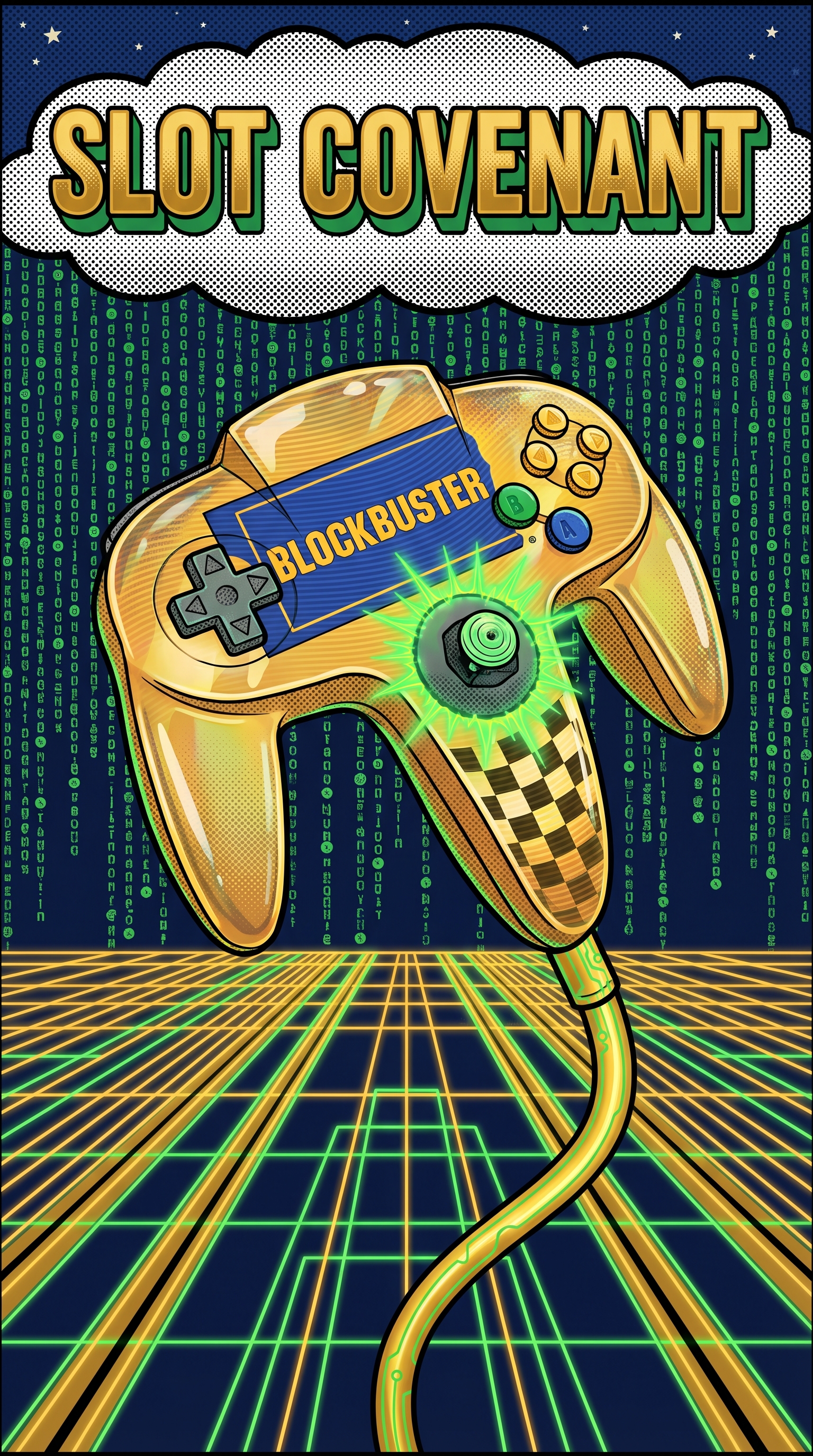 Neon track boundaries that glow with Blockbuster gold, magnetic attraction lines showing player trajectory, velocity indicators pulsing in midnight blue, rubber slot guides wrapping around player essence, voltage auras emanating from the covenant seal.