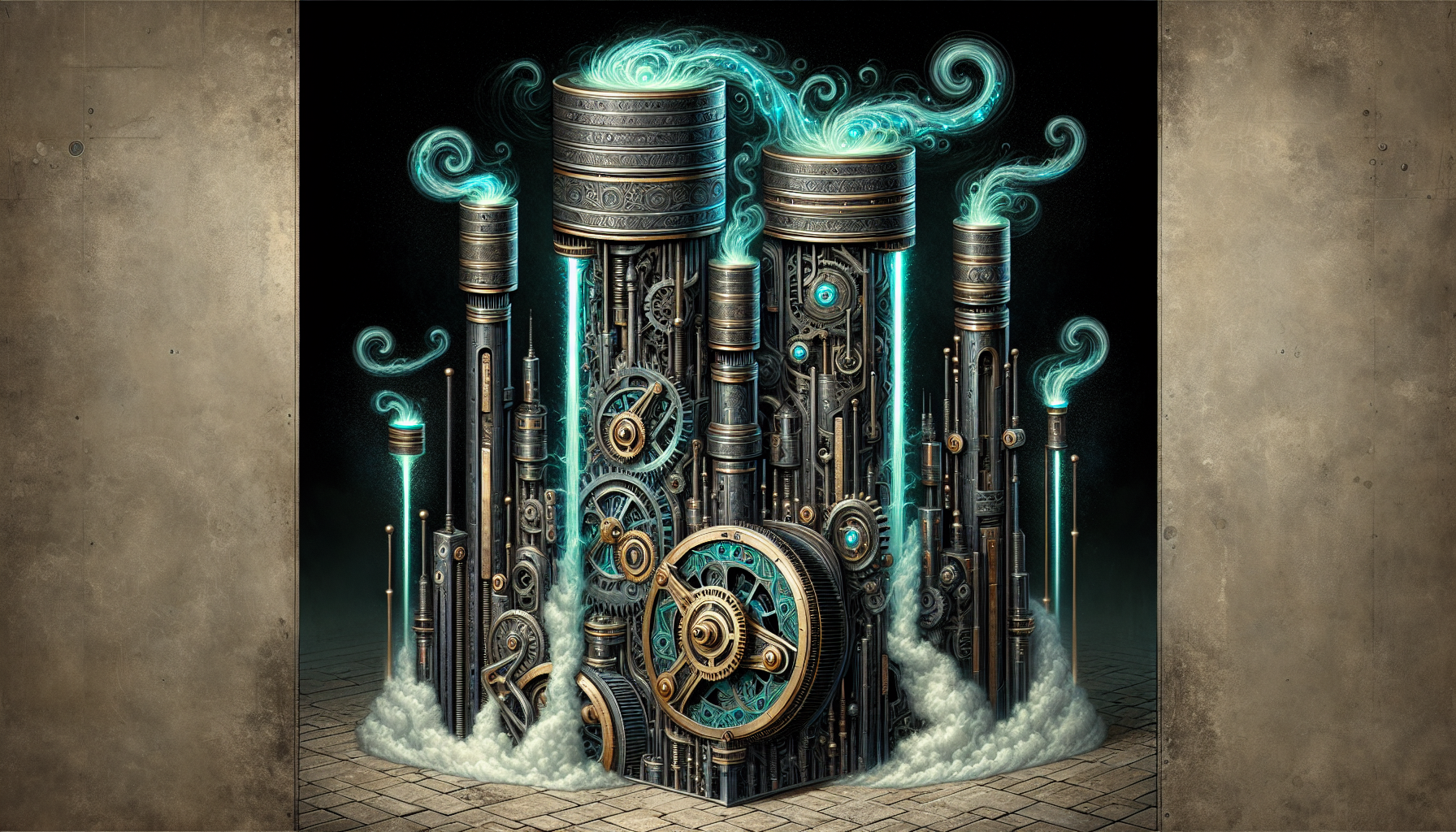 The Steamforge Catalyst is a massive, rune-encrusted piston that generates immense steam power. It is made of dark iron with glowing teal runes that pulse with magical energy. The piston is capable of converting magical energy into mechanical force with unprecedented efficiency, making it a key component in the faction's machinery.