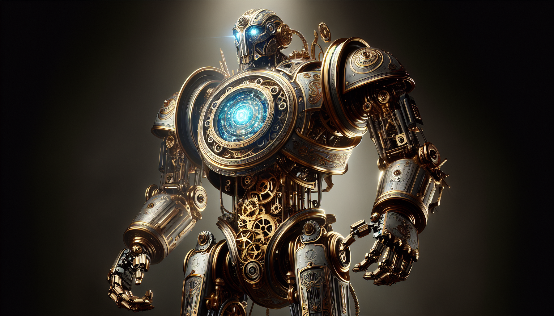 The Clockwork Sentinel is a towering figure made of intricately engraved brass gears and plates. It is powered by a combination of steam and magical energy, allowing it to move with precision and grace. The Sentinel's core is a complex array of gears and springs, each meticulously calibrated to maintain perfect balance. Its eyes glow with a soft blue light, a sign of the magical energy that flows through its mechanical body.