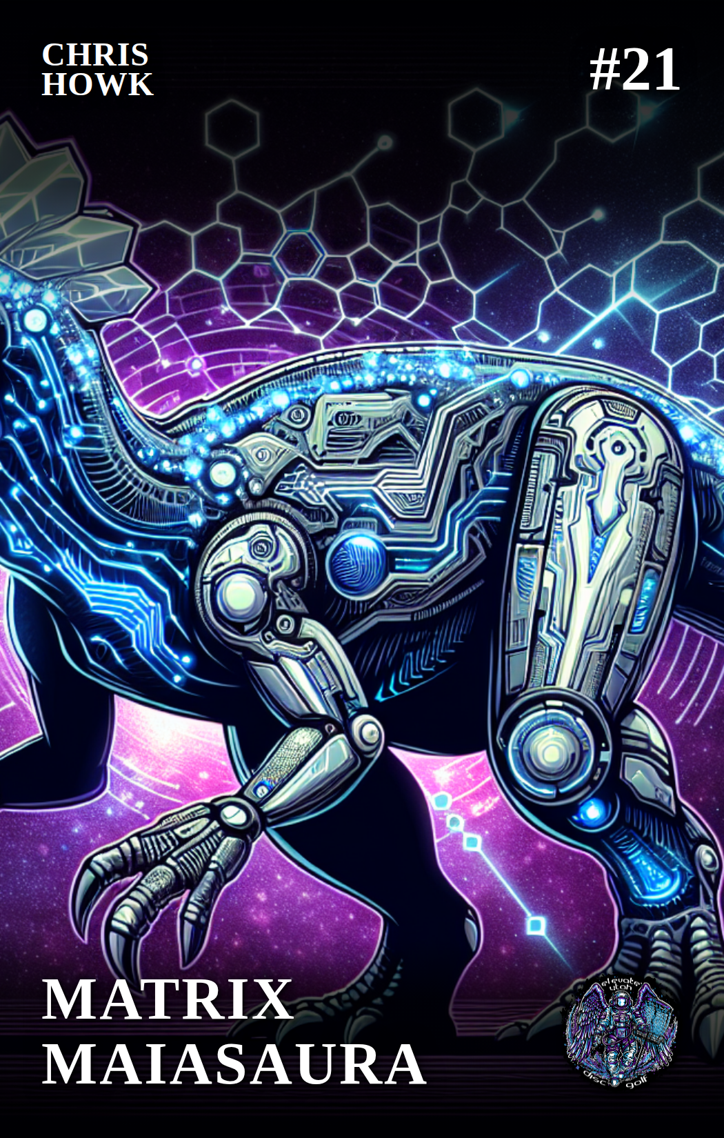The Matrix Maiasaura features a neural web of quantum processors integrated throughout its nervous system, allowing it to create protective digital fields around itself and allies. Its augmented brain can process thousands of tactical scenarios per second while maintaining the species' natural protective instincts. The dinosaur's hide is enhanced with photoreactive scales that can generate holographic shields.