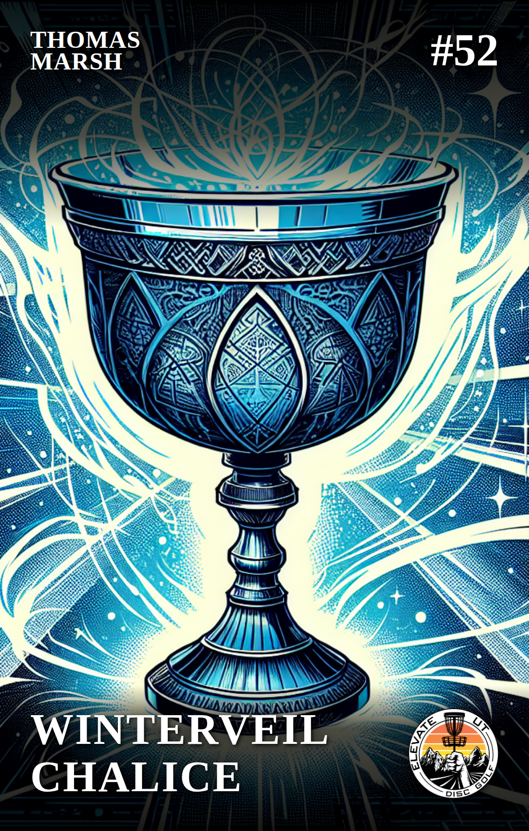 The chalice's translucent ice walls are etched with intricate symbols depicting the terrain, obstacles, and flora of a sacred disc golf course. Within its frozen depths swirls a perpetually liquid core, capable of revealing visions of the course's past when properly channeled.
